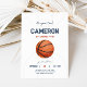 Puntee en grande con la minimalista invitación de cumpleaños de nuestros niños con temas de baloncesto. Su diseño elegante y sencillo capta el espíritu del juego, lo que lo convierte en una elección ideal para los jóvenes amantes del baloncesto que celebran su día especial.