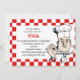 Invitación informal con antecedentes de cheque rojo y blanco y un chef. Ideal para cualquier celebración y edad.La tarjeta es fácil de personalizar con su redacción, fuente, color de fuente y elección de seis tipos de papel.