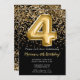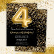 Elegante invitación de fiesta de cumpleaños en negro y oro para un chica de 4 años con elegante escritura de escritura de diseño de fuentes de oro y divertidos globos de Relieve metalizado.