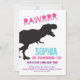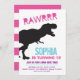 Prepárense para divertirse en esta fiesta de cumpleaños de los dinosaurios T Rex. Esta invitación a comer está decorada con tonos rosa, azul y violeta, ideal para cualquier niñita. ¡Va a ser Dino-mite!