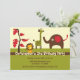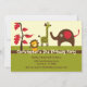 La invitación para la fiesta de cumpleaños de este niño es de 5 x 7 y tiene un moderno tema de animales retro. Hay un león, una jirafa y un elefante encima de la información fácilmente personalizable fiesta. Copyright revidevi http://www.revidevi.com