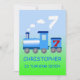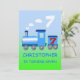 Un pequeño tren inflando el número siete. Una invitación a una fiesta de cumpleaños que puedes personalizar.