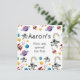 Invitaciones para fiestas de primer cumpleaños en el espacio exterior con fondo de cielo estrellado, planetas del sistema solar esparcidos alrededor del borde, un barco con cohetes, astronauta y una plantilla moderna de celebración de primer cumpleaños que es fácil de personalizar.