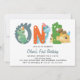 Invita a tu familia y amigos a celebrar el primer cumpleaños de tu hijo con estas lindas invitaciones de dinosaurios. Este diseño presenta el guión tipográfico uno con dinosaurios coloridos. Perfecto para el tema Dino fiesta.