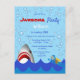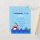 Un tiburón y bajo el agua del mar temían la primera invitación de cumpleaños. Fondo azul, burbujas, olas azules, buceo y tiburón. Plantillas para el nombre del fiesta y detalles secundarios, letras de color azul, rojo y blanco.