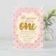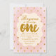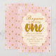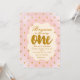 Invitación a la fiesta de cumpleaños número 1 con corazones dorados y rosa