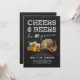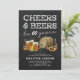 Invitaciones de cumpleaños número 60 para adultos rústicos con fondo de pizarra, selección de cervezas de acuarela, pretzel y barril de cerveza, el dicho "cheers & beers to 60 years", y una plantilla de fiesta moderna fácil de personalizar.
