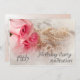 Una hermosa y delicada imagen de un rosa en tonos suaves de color rosa. en el fondo hay una hilera de perlas. El conjunto se suaviza con una pluma tan delicada. Una encantadora invitación para la fiesta de cumpleaños. Cambiar la espalda a los detalles de su propio fiesta