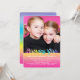 Esta brillante y colorida invitación de cumpleaños dice "Chicas de cumpleaños" en colores arcoiris. En la parte trasera de la tarjeta hay rayas de color acuático en rosa, naranja, amarillo, verde, agua, azul y violeta. La imagen de plantilla es propiedad de Orabella Prints y, por lo tanto, está protegida por derechos de autor. Copiar o usar esta foto de cualquier manera está estrictamente prohibido.