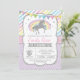 Invitación de cumpleaños colorida con un unicornio de plata con arcoiris mágico salpicado de estrellas purpurinoso