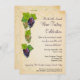 Una vid con cuatro racimos de uvas vitivinícolas se alinean a la izquierda de esta invitación para un evento de cata de vinos o un fiesta de cócteles. La vid serpentea detrás de las uvas con un fondo pergamino. El pergamino se repite al revés junto con la vid de uva para cualquier información adicional o se puede borrar el texto para dejar la parte trasera negra con sólo un racimo de uvas. Disponible con productos a juego.
