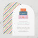 Una pila de maletas coloridas se sienta en la parte superior de esta caprichosa invitación a la fiesta de despedida. Debajo de la ilustración del equipaje hay espacio para el nombre del invitado de honor y los detalles de la fiesta. La parte posterior de la tarjeta presenta un patrón de franjas diagonales coordinadas. ¡Esta invitación es perfecta para cualquiera que esté a punto de embarcarse en una nueva aventura!