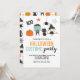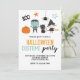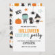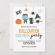 Invitación a la fiesta de disfraces de Halloween. Una invitación Spooktacular bash con bruja linda, gato, calabaza y frankenstein.