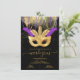 Invitaciones modernas de fiesta de disfraz de Mardi Gras con oro y púrpura. Cuenta con una máscara de oro con plumas, cuentas colgantes y fondo de confeti de polvo de oro. Oro falso.