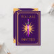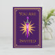 Invitación de cumpleaños de espada morada mágica perfecta para un héroe de 5 años. Ideal para fiestas temáticas de guerreros de fantasía y celebraciones épicas para niños. Texto editable para nombre, fecha y detalles de la fiesta.