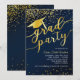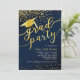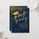 Este diseño de invitación para graduación presenta un fondo azul oscuro con un confetti purpurina dorado, gorra de graduación con una letra de tassel y "fiesta de grado".