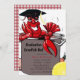 Te encantará este fondo rojizo y blanco a raqueta de gingham con una olla hirviendo y una langosta, golosinas y un gorra de graduación.