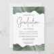 En esta moderna invitación a la fiesta de graduación se encuentra un borde superior y inferior de agate acuático en tonos verde sabio con detalles falsos de purpurina plateado. La palabra "Graduación" aparece en falso purpurina plateado en letra decorativa moderna de escritura a mano. Personalizar la invitación con el nombre del graduado en verde salvia y los detalles del fiesta en gris carbón sobre un fondo blanco. En el reverso aparece una imagen similar de la agata verde sabio y plata.