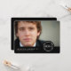Un diseño simple y moderno que presenta la foto de tu graduado en la parte delantera con todos los detalles del fiesta o la invitación en la parte trasera. El diseño clásico del sello de tipografía blanca en un crujiente borde negro en la parte inferior de la tarjeta crea una invitación o invitación intemporal y elegante de la celebración de graduación de su hijo.