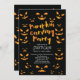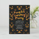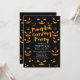 Moderna Invitación de la fiesta de Halloween con calabaza tallada que presenta caras del naranja Jack O Lantern sobre un fondo negro con moderno "fiesta de tallado de calabaza" en tipografía de gradiente naranja. Invitamos a nuestra fiesta de halloween a ver la contraparte para un toque especial.