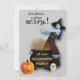 ¡Aquí hay una invitación divertida a la fiesta de disfraces de Halloween! El frente presenta una bruja como zombie realista con los brazos extendidos sobre un caldero negro humeante. Al lado del caldero hirviendo, sentarse un farol naranja jack o' y un cráneo blanco brillante. El texto estilizado en la parte superior dice en negro "¡Coma, bebe y asusta!" En el caldero hay un brillante texto naranja que dice "¡en nuestra fiesta de Halloween!" Las imágenes y el texto se colocan en un fondo gris claro. La parte posterior de la invitación tiene el mismo fondo gris, con el texto personalizado en negro. Es fácil y fácil de decir lo que te gustaría.