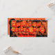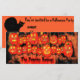 21 calabazas de Halloween naranjas brillantes Invitación a la fiesta de arte de Halloween en fondo negro con fantasmas flotando. Texto La Rampage de Calabazas en texto extraño. La parte trasera muestra un gato negro de Halloween en una calabaza iluminada amarilla con información para rellenar. Muchas calabazas lindas riendo.