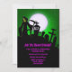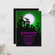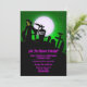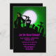 El Parador Grim en un patio de tumbas con luna llena y fondo verde. Diseño muy divertido y aterrador para tu invitación a la fiesta de Halloween.