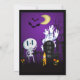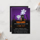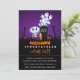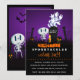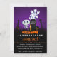 Una divertida y espeluznante invitación a una fiesta de Halloween. Ambientada en un cementerio oscuro y aterrador. Una lápida dice RIP, con una vela y algunas calaveras brillantes en el suelo. Una vieja cerca crujiente se inclina hacia un lado. Un esqueleto sonriente y lindo está saludando con la mano y algunos fantasmas con aspecto genial están girando en el aire. Puesta en un fondo degradado negro y púrpura. Personaliza con los detalles de tu fiesta de Halloween espeluznante. Fiesta de disfraces o fiesta de truco o trato o cualquier tema de fiesta de Halloween que tengas, el título se puede personalizar fácilmente.