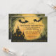 La invitación a la fiesta de Halloween para los niños presenta un diseño divertido y espeluznante, con una casa embrujada como elemento central. La casa, muy frecuentada, se sitúa sobre un fondo vibrante de tonos amarillos y verdes, lo que crea un ambiente lúgubre y a la vez espeluznante. Alrededor de la casa hay caricaturas, árboles aterradores con ramas rotas y algunos murciélagos simpáticos volando por ahí, añadiendo un toque de espanto sin ser demasiado aterrador. En la parte superior del frente de batalla, la leyenda dice: "¡Únete a nosotros para una fiesta de Halloween infantil Spooktacular!" La letra divertida es brillante y llamativa, perfecta para un evento infantil. Debajo del título, hay espacio para los detalles del evento, incluyendo la fecha, hora y ubicación, que se pueden personalizar para que se ajusten a sus planes fiestas específicos. La parte trasera de la invitación presenta los mismos tonos vivos amarillos y verdes, con la casa embrujada, murciélagos y árboles aterradores sutilmente desvanecidos en el fondo, creando un diseño cohesivo. Este lado se deja en blanco para notas, dibujos o detalles adicionales, lo que permite un acabado limpio y sencillo. Esta invitación está diseñada para ser a la vez espeluznante y divertida, lo que da el tono perfecto para una memorable fiesta de Halloween infantil.