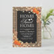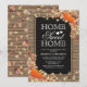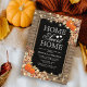 Invitaciones de fiesta de inauguración rústicas con un fondo de madera chic de campo, centro de pizarra negra, cuerda, calabazas de Halloween, follaje de otoño, bellotas, una lluvia de hojas de otoño, luces de hadas y la encantadora frase "hogar dulce hogar", y una plantilla de texto de invitación de fiesta personalizada.