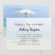 Invitación de fiesta de jubilación con imagen de fondo de sillas de playa. Las plantillas de texto sencillas tienen la ocasión en la parte superior, "Feliz Jubilación" con el nombre del homenajeado a continuación en letra cursiva. El texto restante de la fiesta se agrega en forma de párrafo, así que use todo el texto que desee. La parte posterior es la misma imagen de sillas de playa en color completo. Esto funciona para hombres o mujeres que planean jubilarse a un estilo de vida junto al mar.
