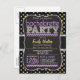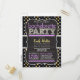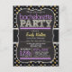 Invitación de la fiesta de la Bachelorette con estilo de pizarra retro sobre el patrón de estrellas negras, grises oscuras y amarillas con elementos de diseño de ric púrpura y invitación de tipografía con apariencia de tiza.