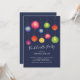 Invitación a una fiesta de soltera de verano con lámparas de papel coloridas colocadas sobre un fondo azul marino.