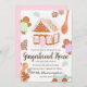 Una linda casa de jengibre que gotea con glaseado blanco nevado y adornos de dulces pastel. Ventanas rosadas bonitas y una puerta arqueada en un marco marrón de canela especiada. Las gotas de goma, las galletas de jengibre, el cacao caliente y una cuchara de madera enmarcan el texto de la invitación.
