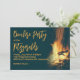 Plantilla de invitación a una fiesta de hoguera en el patio trasero. Un diseño de fuego ardiente con fondo azul muy oscuro y texto amarillo-naranja. El título de la fiesta y el nombre / ubicación están en letra grande. Esta invitación horizontal es perfecta para una reunión informal con amigos o para celebrar un cumpleaños.