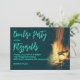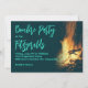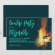 Plantilla de invitación para una fiesta de hoguera en el patio trasero. Un diseño de fuego ardiente con fondo azul muy oscuro y texto amarillo. El título de la fiesta y el nombre / ubicación están en letra grande. Esta invitación horizontal es perfecta para una reunión informal con amigos o para celebrar un cumpleaños.