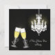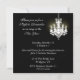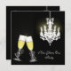 Elegante invitación de fiesta de Año Nuevo hecha en negro azabache, con hermosos gráficos de una silueta de araña, en blanco, con velas brillantes. Dos vasos decorativos de champán en el lado izquierdo de la invitación y texto de escritura blanca dice Fiesta de Nochevieja. El reverso de la invitación también se realiza en negro, con la misma versión más pequeña de la lámpara de araña, en la esquina superior derecha. El texto blanco es totalmente personalizable para satisfacer las necesidades de su fiesta. Hermosa manera de sonar en el nuevo año.