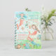 Una invitación a una fiesta de los niños con acuarela pintada con sirenas bajo el agua rodeadas de caballitos de mar, conchas, algas y peces de estrella.