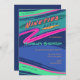 La invitación a la fiesta de los noventas presenta una tipografía de colores llamativos de "Fiesta de los Noventas". Este diseño incluye elementos de verdes, naranjas, púrpuras y rosas, colores en bloque y elementos de diseño abstracto inspirados en los 90.