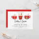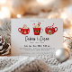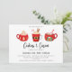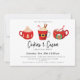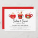 Un trío ilustrado de tazas de cacao caliente de invierno, invitación de fiesta de vacaciones. Texto de plantilla de diseño de tipografía de moda con respaldo de color rojo de coordinación sólida.