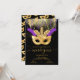 Invitaciones modernas de fiesta de máscaras de Mardi Gras en oro y púrpura. Cuenta con una máscara dorada con plumas, cuentas colgantes y fondo de confeti de polvo de oro. Oro falso.