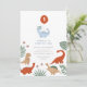 Dinosaur 1st Birthday Party Invitation presenta un dinosaurio azul pastel que sostiene un globo rojo con el número 1 dentro del globo en un ambiente colorido y divertido con temas de dinosaurios. Personalizar con la edad, nombre y detalles del fiesta de su hijo.