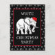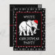 Un fondo negro, cubierto de copos de nieve, en la parte delantera. La parte delantera es un elefante blanco con un sombrero de Navidad y texto blanco en un marco negro. La parte trasera tiene todos los detalles de la fiesta.