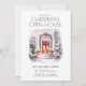 Invitación a una fiesta de Navidades de la casa abierta acuarela con una casa, árboles verdes y nieve. Personalice las invitaciones de sus Navidades con los detalles de su fiesta.