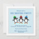 Un trío de patinaje sobre hielo de pingüinos en un pequeño estanque con un fondo nevado de azul helado, invitando a sus huéspedes a un divertido fiesta sobre patinaje sobre hielo.