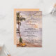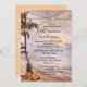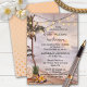 Un post romántico o después de una boda invitación con una playa tropical al atardecer con luces de cuerda en palmeras y una piña con flores. Ideal para una celebración de recepción o después del boda.