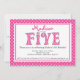 Comience su quinta fiesta de cumpleaños con nuestra adorable polka rosa pone el alfabeto dulce invitación de cumpleaños de las chicas. Nuestra encantadora invitación para el cumpleaños chica incluye la palabra "cinco" en un patrón de puntos polka blanco y rosado sobre un fondo blanco con un marco de borde punteado de polka rosa y blanco.