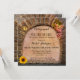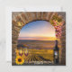 Una original invitación a la fiesta de retiro con un cuadro de un arco romano con uvas, una linterna y copas de vino y una botella con girasol, con vistas a un paisaje de viñedos al atardecer. También puede personalizar esta invitación para otras ocasiones si lo desea.
