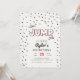 Celebre el cumpleaños de salto y rebote de su hijo con nuestra invitación de cumpleaños de trampolín o castillo hinchable rojo, negro y gris. Este diseño presenta colores llamativos y tipografía divertida.