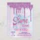 Esta invitación a la fiesta de slime brillante es perfecta para cualquier fiesta de slime con acentos rosados, morados y brillantes.